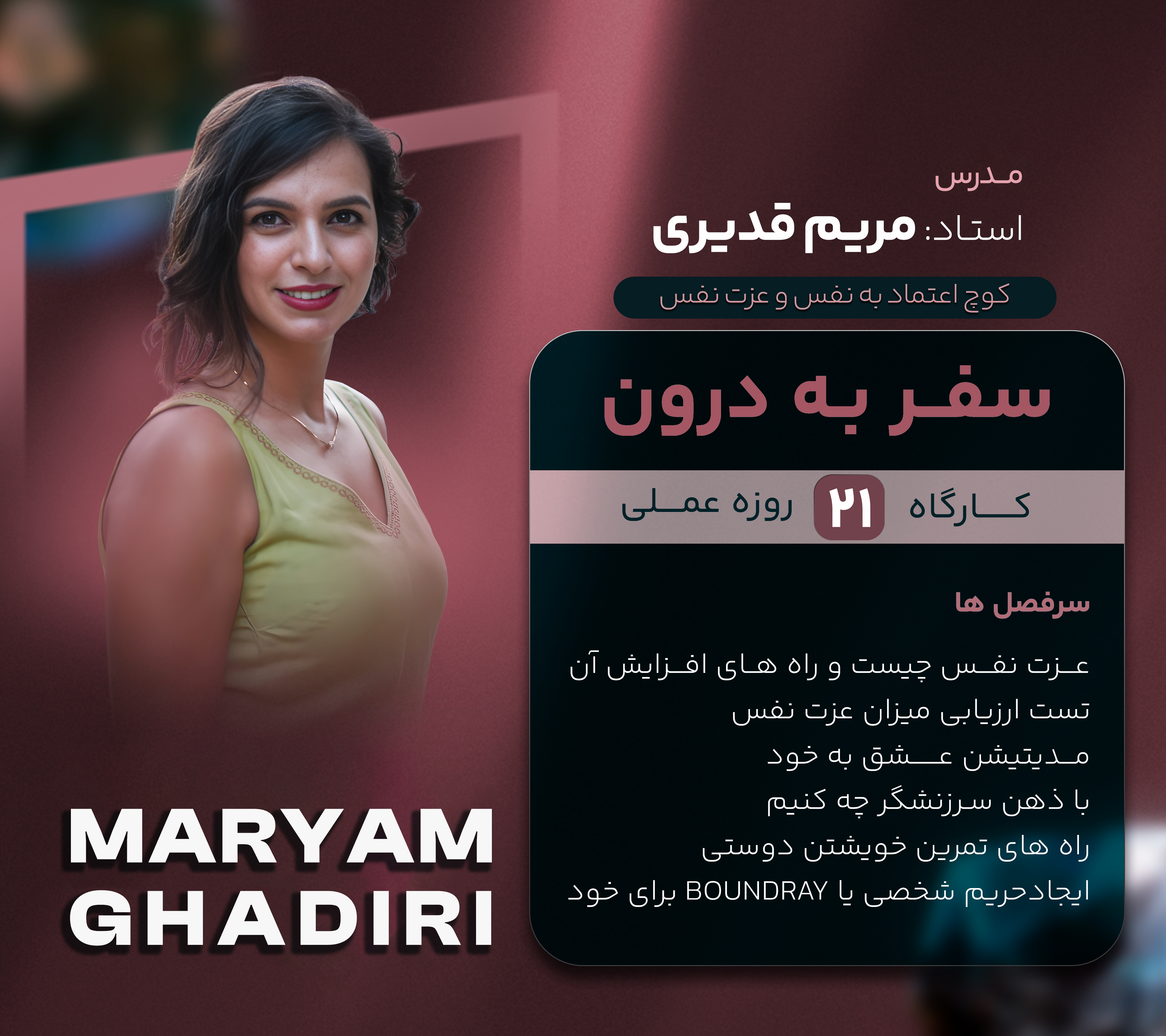 در این کارگاه 21 روزه شما بصورت عملی با تمرین ها و فایل های صوتی و تصویری راه های افزایش عزت نفس را مرور میکنید و در سه جلسه ی آنلاین کوچینگ با دکتر مریم قدیری راه های خویشتن دوستی را تمرین میکنید.
