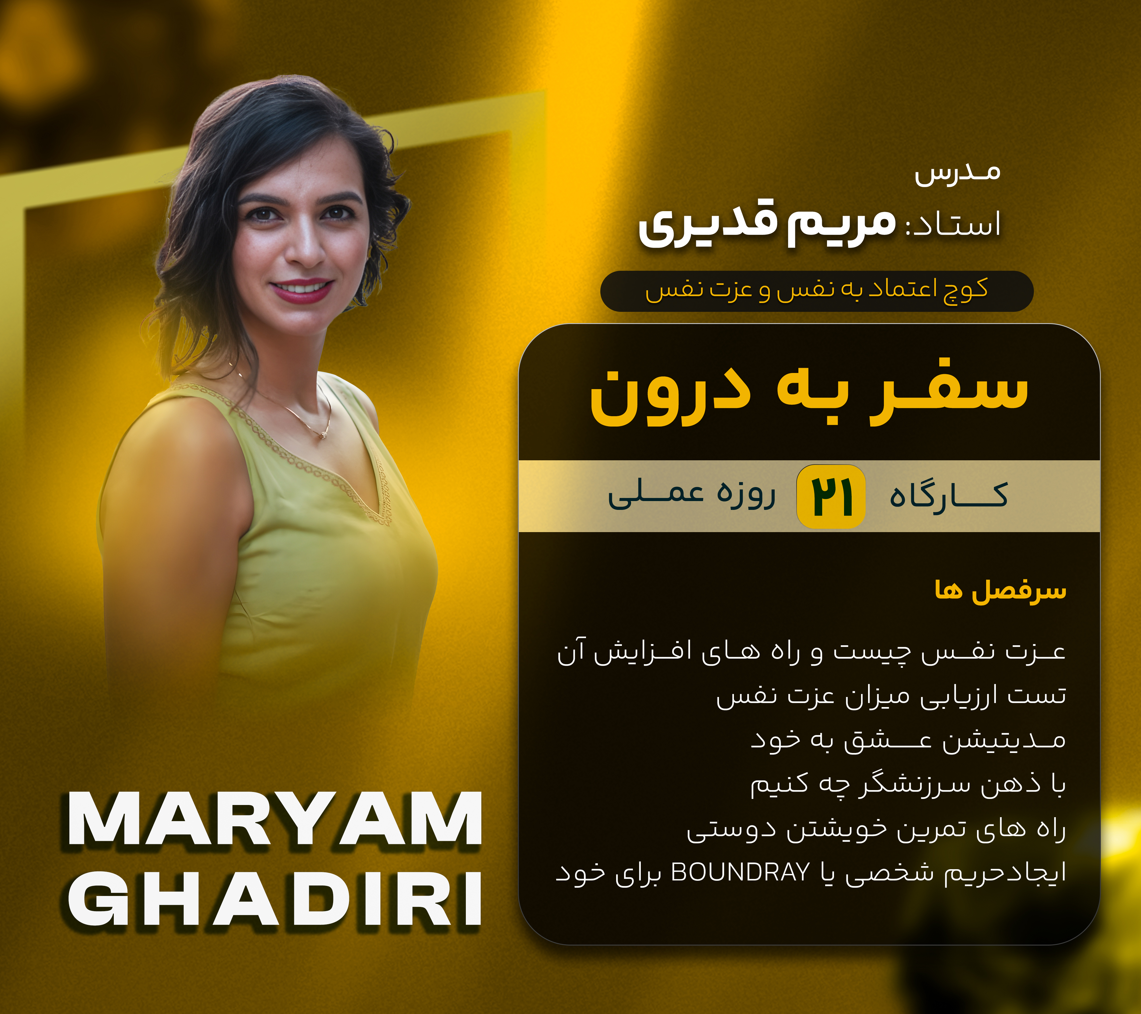 در این کارگاه 21 روزه شما بصورت عملی با تمرین ها و فایل های صوتی و تصویری راه های افزایش عزت نفس را مرور میکنید و در سه جلسه ی آنلاین کوچینگ با دکتر مریم قدیری راه های خویشتن دوستی را تمرین میکنید.